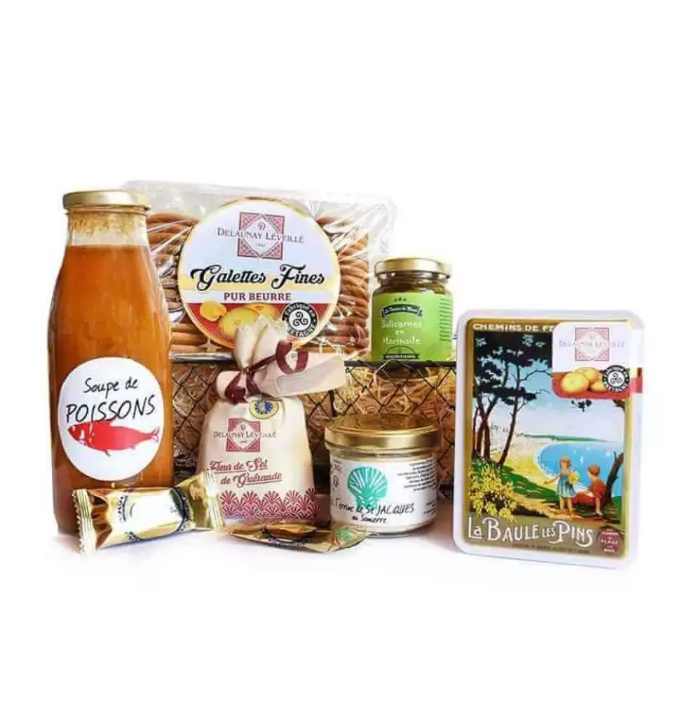 Pot of salicornia Fleur de sel sachet and salt scoop Tray of fine Breton pancakes Fish soup Terrine of Saint-Jacques Box filled with pure butter cookies Rectangle basket Net weight: 2.4 kg