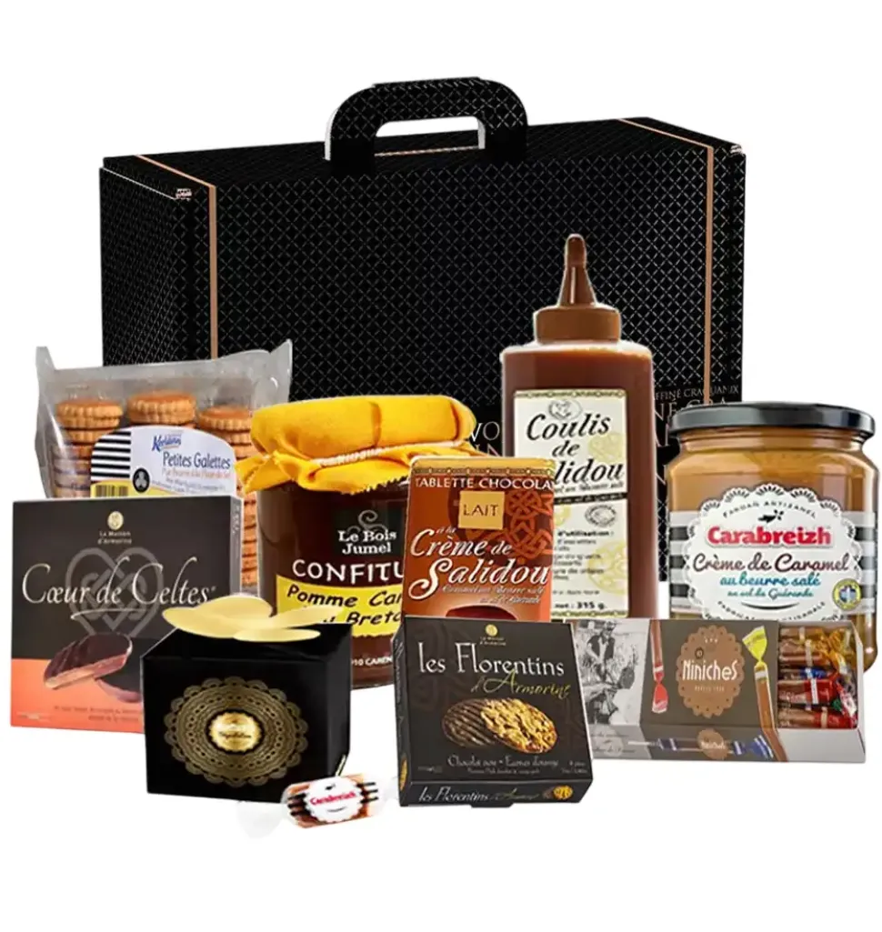 Unwrap a taste of Brittany’s magical flavors with this delightful basket filled with sweet surprises. Relish the Celtic Hearts crafted in dark chocolate and Salidou, alongside a tempting mini milk chocolate bar enriched with Salidou cream. The Breton-style Caramel Apple jam brings a fruity twist, while Niniches’ delightful Pencil Cases add a playful touch. Indulge in rich Salted Butter Caramel Cream and Dark Chocolate Florentines, turning every moment into a special occasion.
