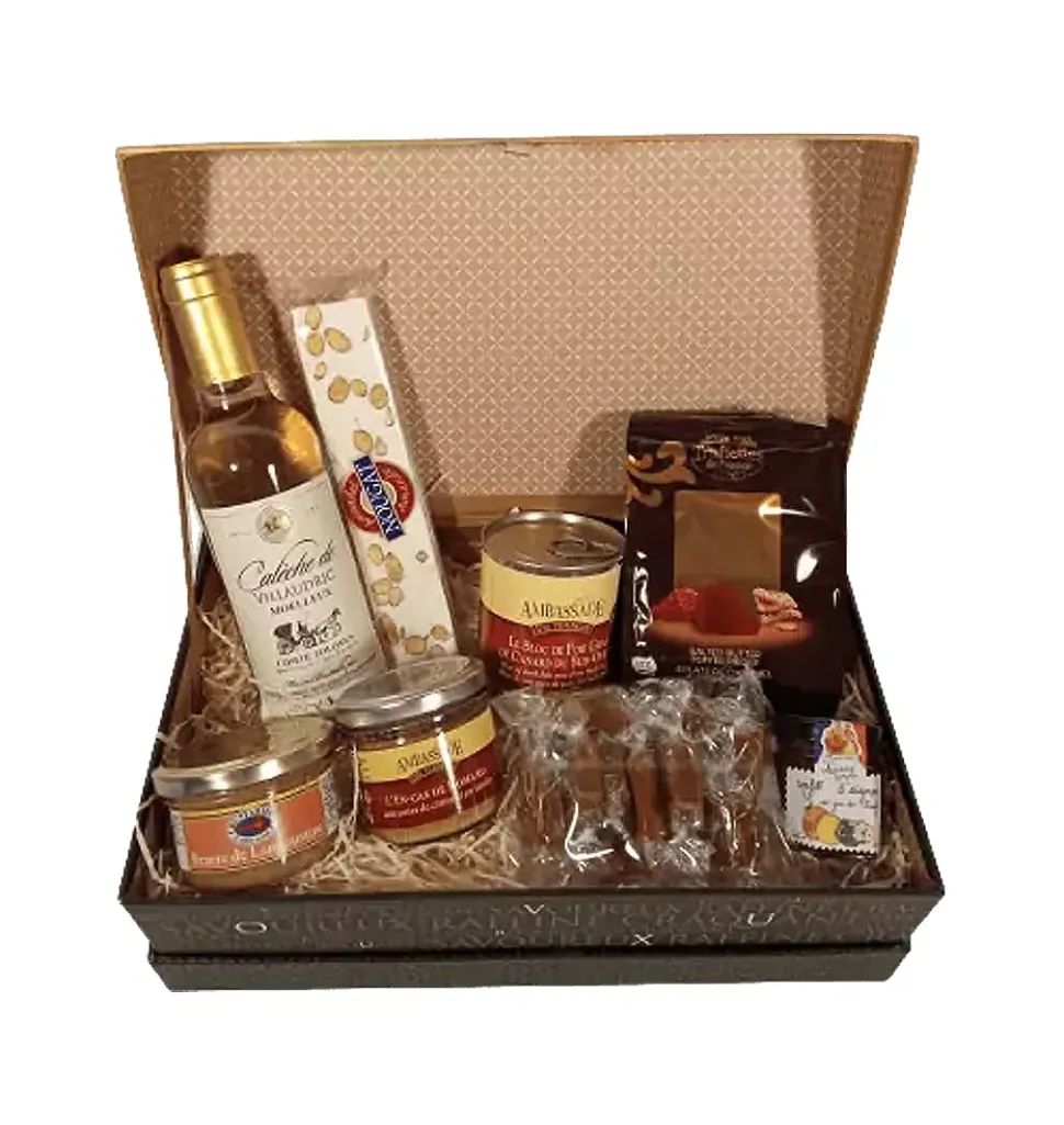 Elevate your dining experience with our French Feast Delight, a celebration of French culinary art that’s perfect for connoisseurs. This premium gift set brings together an array of gourmet delights, beginning with a bottle of Villaudric Comte Tolosan sweet white wine—perfectly chosen to complement your luxurious meal. Delight in the creamy duck foie gras and the unique taste of lobster delicately paired with lemon zest and coriander. Sweet indulgence continues with the included almond nougat and a bag of salted butter caramel. Our selection features a surprise element in the form of caramel chip truffles, providing a sophisticated twist on a classic treat. Housed in an elegant black copper rectangular box, your journey includes the robust favors of rabbit terrine and langoustine butter. It’s all wrapped up with the subtle sweetness of organic fig confit, delivering a memorable gastronomic experience right to your door.