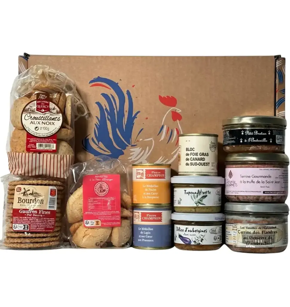 Uncover a delightful collection of flavors from around France with our Taste of French Regions Basket. Housed in a charming kraft suitcase adorned with the French flag, this selection boasts exquisite treats like the luxurious foie gras, authentic pâtés, and sweet orange blossom navettes. It’s a must-have for any culinary enthusiast!