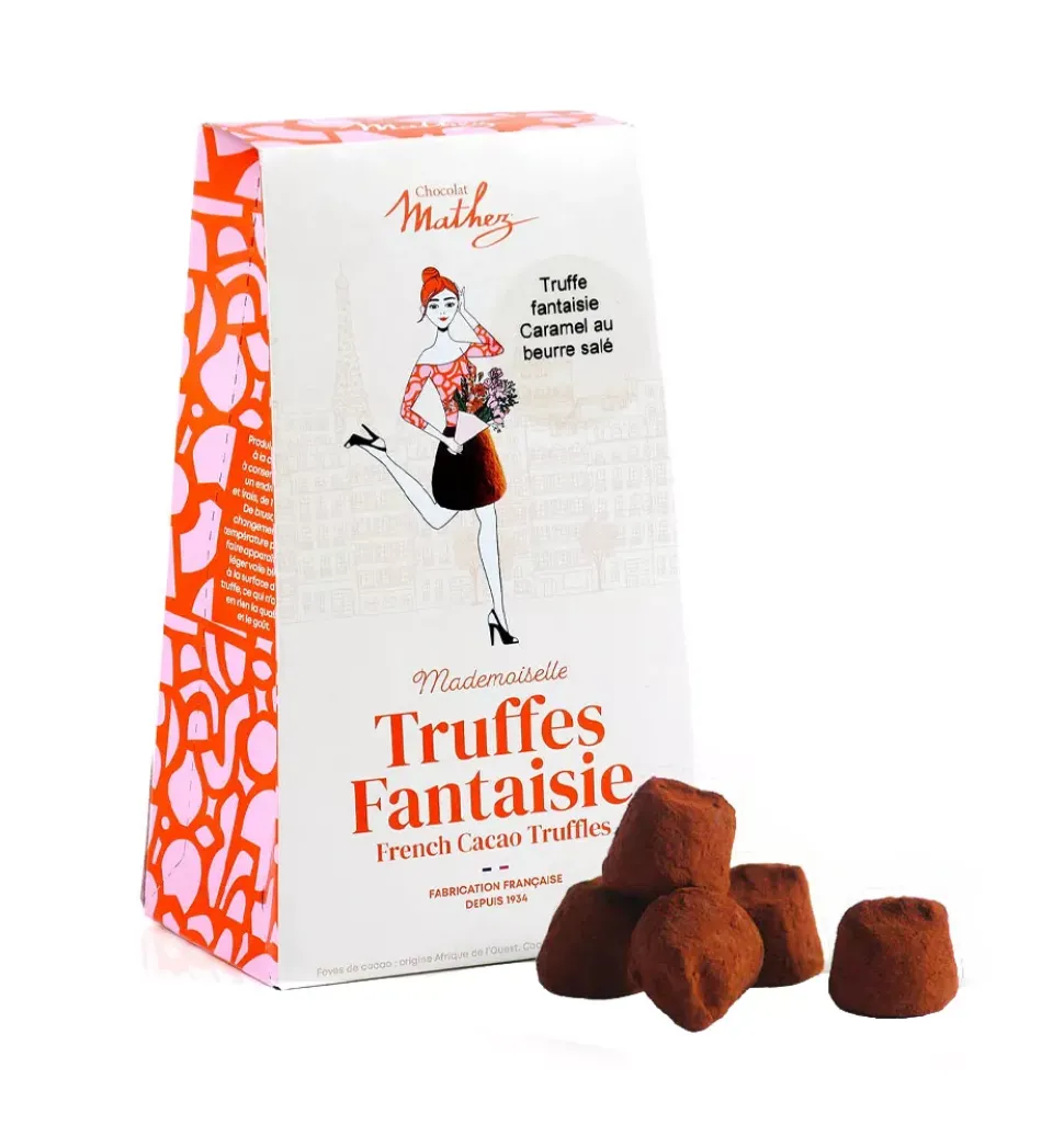 • Fancy truffles with salted caramel chips with natural flavor Box of 100g